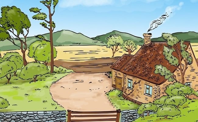 Ezen a képen egy vidéki házikót láthatsz a háttérben mezővel és hegyekkel. A ház otthonosan néz ki, kőkerítés választja el az úttól és fák, bokrok övezik.