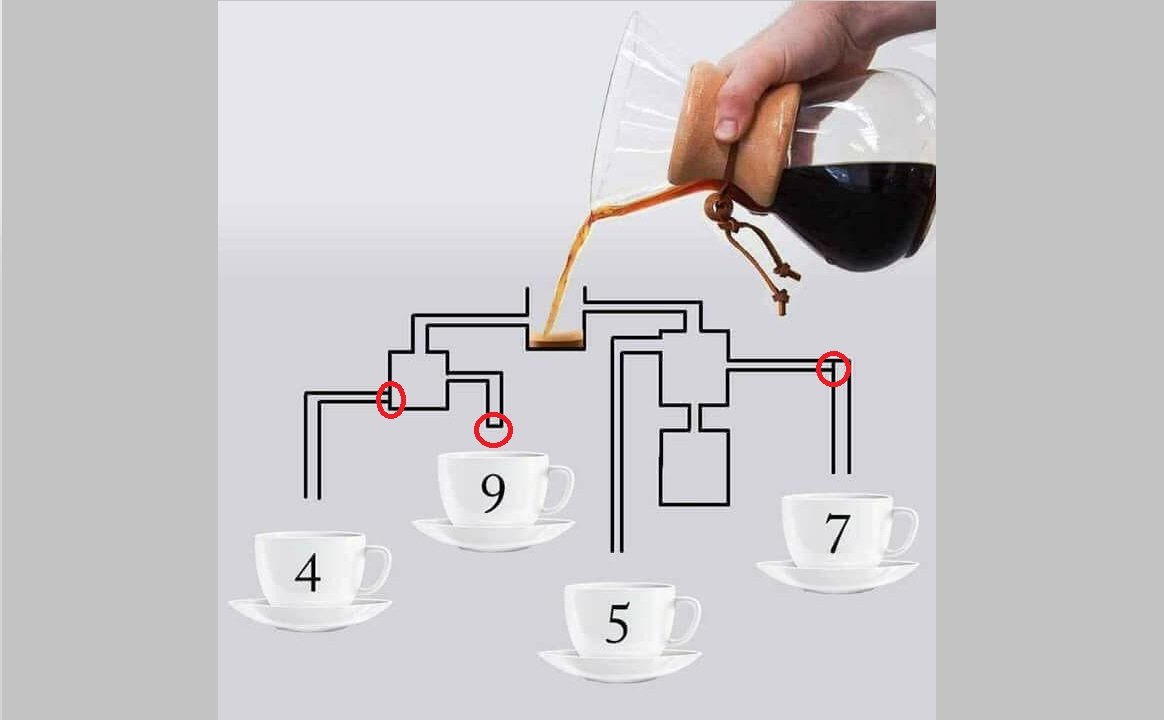 A helyes válasz, az 5- ös számú csésze, mert a másik három csészébe el sem jut a folyadék, mert a csövek le vannak zárva.